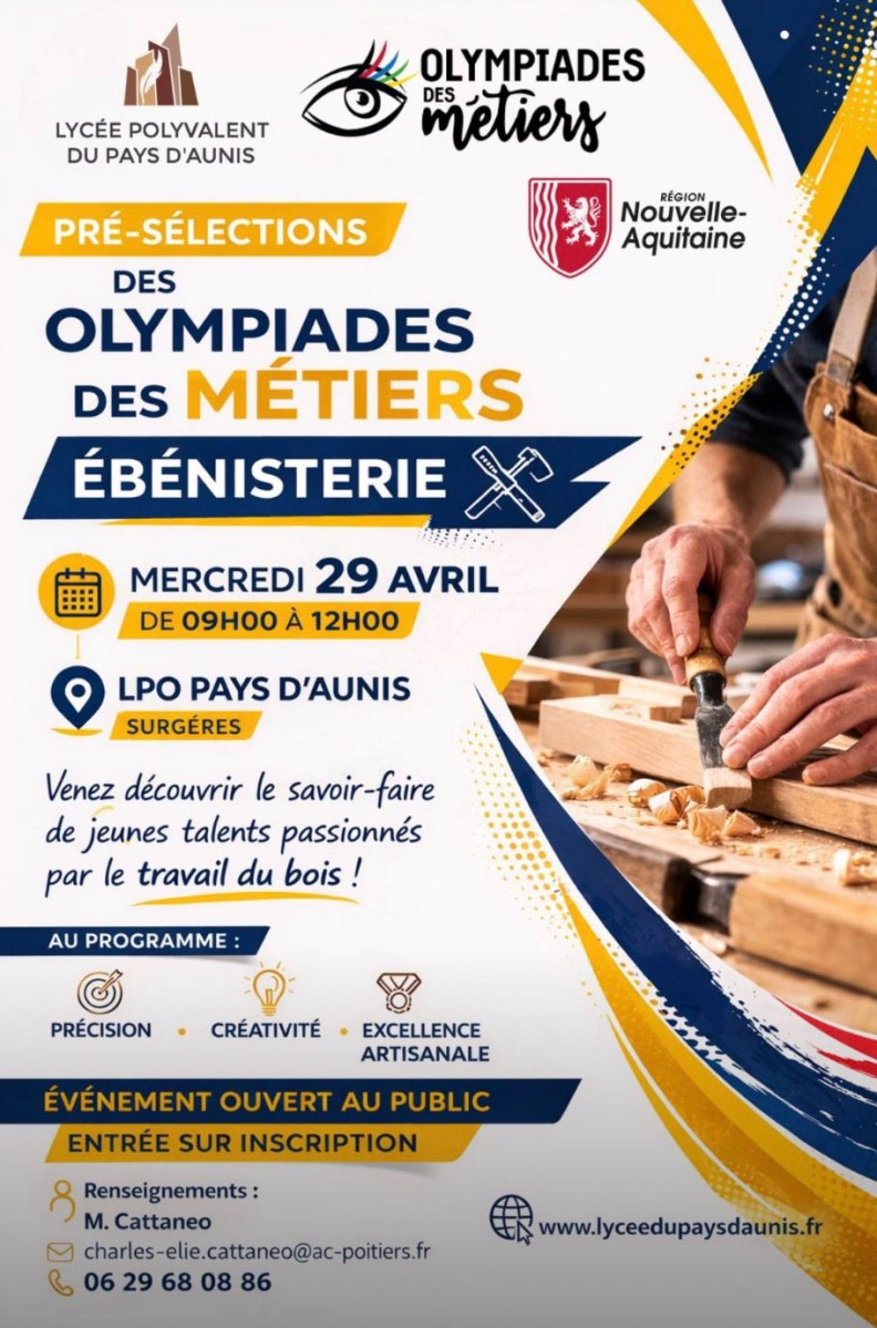 Le CFA académique salue l’organisation des pré-sélections des Olympiades des Métiers en ébénisterie au lycée du Pays d’Aunis, le 29 avril 2026.